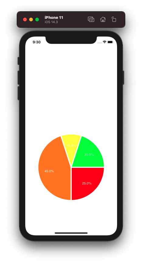 @IBOutlet weak var piChat: UIPieChatView! override func viewDidLoad() { piChat.colors = [UIColor.red.cgColor, UIColor.orange.cgColor, UIColor.yellow.cgColor, UIColor.green.cgColor] piChat.values = [0.25, 0.45, 0.10, 0.20] }각 순서에 맞는 %로 합이 1의 값을 가질 수 있도록 했습니다.