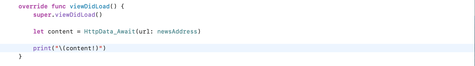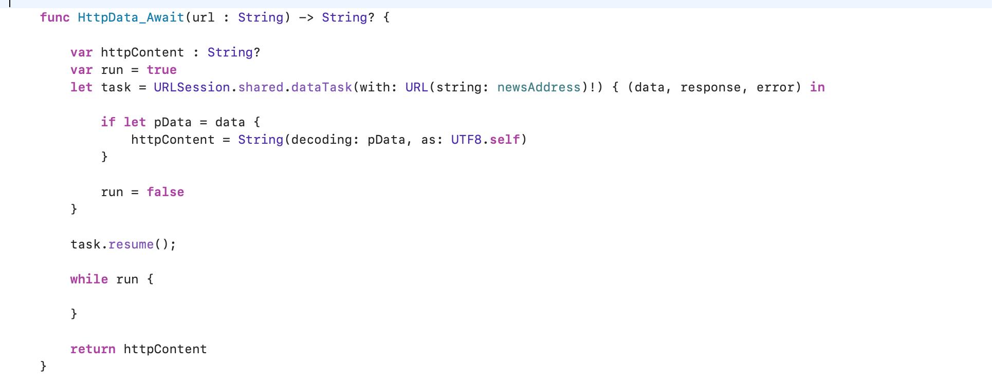 지난 시간에 작성한 코드의 실행해보면 completionHandler가 실행되기 전에 변수 httpContent의 값을 리턴하기 때문에 nil이 나오게 됩니다.
